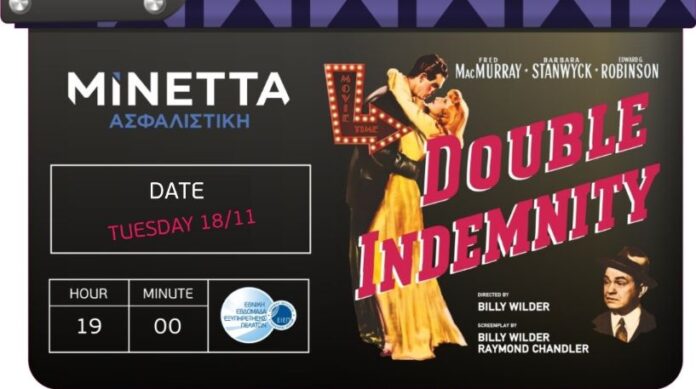 Η προβολή θα γίνει την Τρίτη 18/11 στην Ταινιοθήκη της Ελλάδος, Ιερά Οδός 48 & Μεγάλου Αλεξάνδρου 134-136 (Μετρό Κεραμεικός) και θα ξεκινήσει στις 7 μ.μ. με την ταινία Διπλή Αποζημίωση (Double Indemnity)
