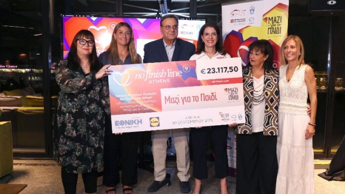 Σε μια ξεχωριστή εκδήλωση που πραγματοποιήθηκε την Τρίτη 30 Σεπτεμβρίου 2025, παραδόθηκε στην Ένωση «Μαζί για το Παιδί» η επιταγή των 23.117,50 ευρώ, ποσό που συγκεντρώθηκε από τα χιλιόμετρα που κάλυψαν οι χιλιάδες δρομείς του φιλανθρωπικού αγώνα No Finish Line Athens που πραγματοποιήθηκε, τον Μάιο, στο ΟΑΚΑ.