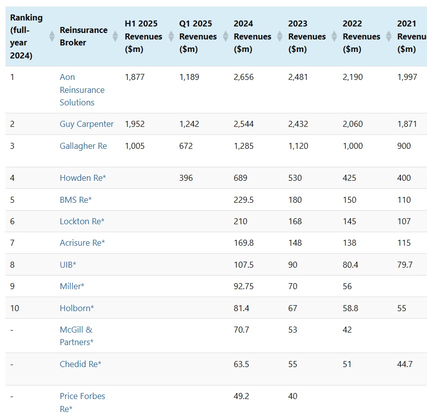 Η κατάταξη με τους μεγαλύτερους μεσίτες αντασφαλίσεων στον κόσμο αποκαλύπτει ότι, με βάση τα έσοδα, η Aon Reinsurance Solutions ηγήθηκε το 2024, ωστόσο, η Guy Carpenter, ο αντασφαλιστικός βραχίονας μεσιτών της Marsh McLennan, προηγείται το 2025.