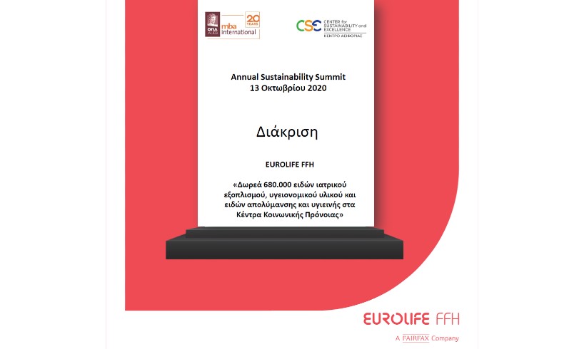 Ειδικό βραβείο για την καινοτομία και την κοινωνική προσφορά της έλαβε η Eurolife FFH στο πλαίσιο του 5ου Annual Sustainability Summit, το οποίο διοργανώθηκε την Τρίτη 13 Οκτωβρίου, από το Κέντρο Αειφορίας (CSE), σε συνεργασία με το MBA International του Οικονομικού Πανεπιστημίου Αθηνών. Συγκεκριμένα, η εταιρεία διακρίθηκε για τη δωρεά ιατρικού εξοπλισμού και υγειονομικού υλικού στις 50 δομές των Κέντρων Κοινωνικής Πρόνοιας όλης της χώρας, ως απάντηση στις αυξημένες ανάγκες τους κατά την περίοδο του γενικευμένου lockdown. Το Annual Sustainability Summit, ένας καθιερωμένος θεσμός-συνάντηση ανάμεσα στην ακαδημαϊκή και την επιχειρηματική κοινότητα, πραγματοποιήθηκε φέτος ως live digital event, με τίτλο «Βιώσιμη Ανάκαμψη: Προκλήσεις και Ευκαιρίες».