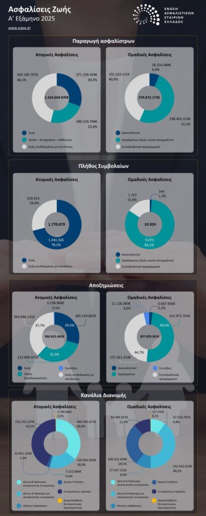 Οι νέες εργασίες του κλάδου για το σύνολο της παραγωγής ασφαλίστρων του πρώτου εξαμήνου του 2025 ανήλθαν σε 416,2 εκατ. € (εκ των οποίων 372,5 εκατ. € από τις ατομικές ασφαλίσεις και 43,7 εκατ. € από τις ομαδικές ασφαλίσεις).