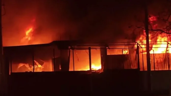 Σύμφωνα με εκπρόσωπο του τοπικού δήμου από την πυρκαγιά καίγονται τουλάχιστον τρία κτίρια: μία αποθήκη με πλαστικά, μια επιχείρηση με υφάσματα και μία ακόμα επιχείρηση. Τα δύο από τα κτίρια έχουν καταστραφεί σχεδόν ολοκληρωτικά.