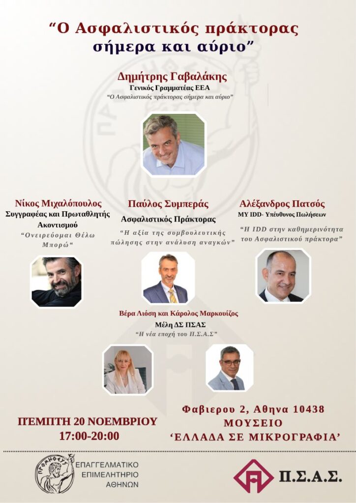 «Ο Ασφαλιστικός πράκτορας σήμερα και αύριο», η οποία θα πραγματοποιηθεί την Πέμπτη 20 Νοεμβρίου 2025, από τις 17:00 έως τις 20:00, στο Μουσείο “Ελλάδα σε Μικρογραφία” (Φαβιέρου 2, Αθήνα).