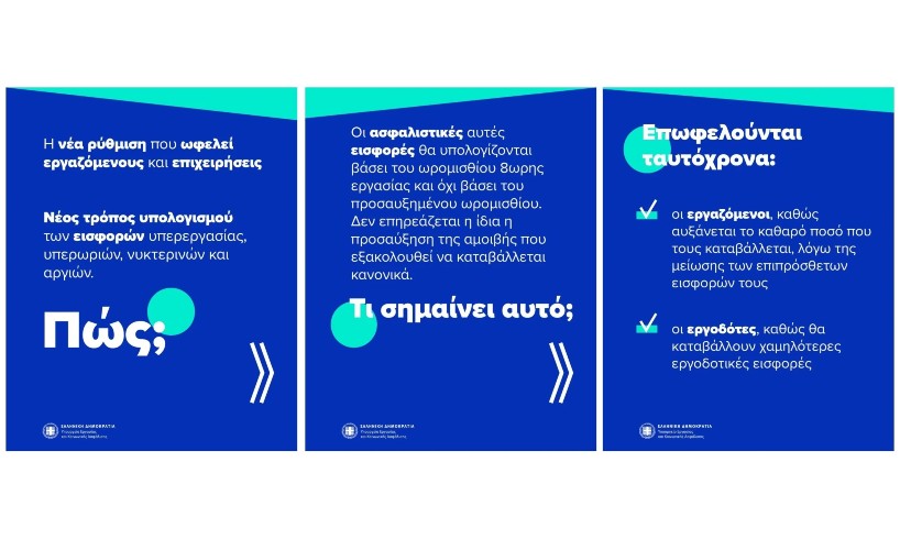 «Το Υπουργείο Εργασίας προχωρά σε νέα ρύθμιση για τη κατάργηση των προσαυξήσεων στις ασφαλιστικές εισφορές που αφορούν υπερεργασία, υπερωρίες, νυχτερινή εργασία, και απασχόληση σε Κυριακές και αργίες. Η ρύθμιση αυτή δεν επηρεάζει το ύψος των προσαυξήσεων που προβλέπονται για την αμοιβή της υπερεργασίας, των υπερωριών, της νυχτερινής εργασίας και της απασχόλησης σε Κυριακές και αργίες, οι οποίες εξακολουθούν να καταβάλλονται κανονικά. Η πρωτοβουλία αυτή αποτελεί συνέχεια της οριζόντιας μείωσης των ασφαλιστικών εισφορών κατά 5,4 ποσοστιαίες μονάδες από το 2019, που έχει συμβάλει αποφασιστικά στην αύξηση της απασχόλησης και τη μείωση του ποσοστού ανεργίας στη χώρα μας. Σαν αποτέλεσμα της ρύθμισης μειώνεται το μη μισθολογικό κόστος των επιχειρήσεων και ενισχύεται το διαθέσιμο εισόδημα των μισθωτών πλήρους απασχόλησης. Με αυτή τη ρύθμιση βελτιώνεται η ανταγωνιστικότητα της οικονομίας, αμβλύνονται οι «στενότητες» που παρατηρούνται σε πολλούς κλάδους οικονομικής δραστηριότητας και αναβαθμίζεται το βιοτικό επίπεδο των εργαζομένων».