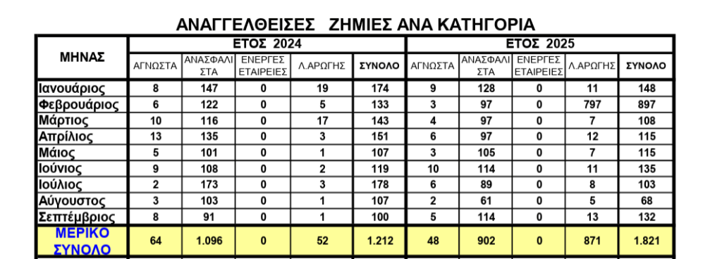 Συγκεκριμένα οι ζημιές οπό ανασφάλιστα οχήματα που δηλώθηκαν στο Επικουρικό Κεφάλαιο στο 9μηνο του έτους ήταν 902 όταν το αντίστοιχο διάστημα του 2024 ήταν 1096.