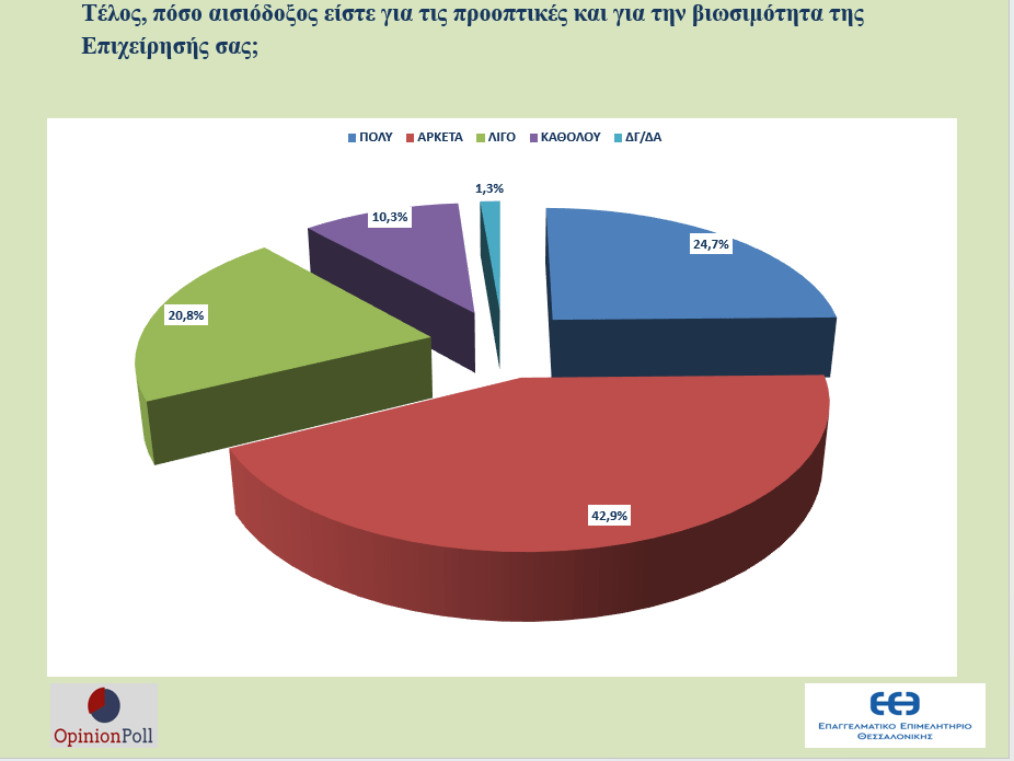 - Υπάρχει απαισιοδοξία ως προς την βιωσιμότητα Επιχειρήσεων από περίπου έναν στους τρεις . Το 20.8% δηλώνει λίγο και το 10.3% καθόλου αισιόδοξο για τις προοπτικές και την βιωσιμότητα της Επιχείρησής του. Το 24.7% δηλώνει πολύ αισιόδοξο και το 42.9% αρκετά.
