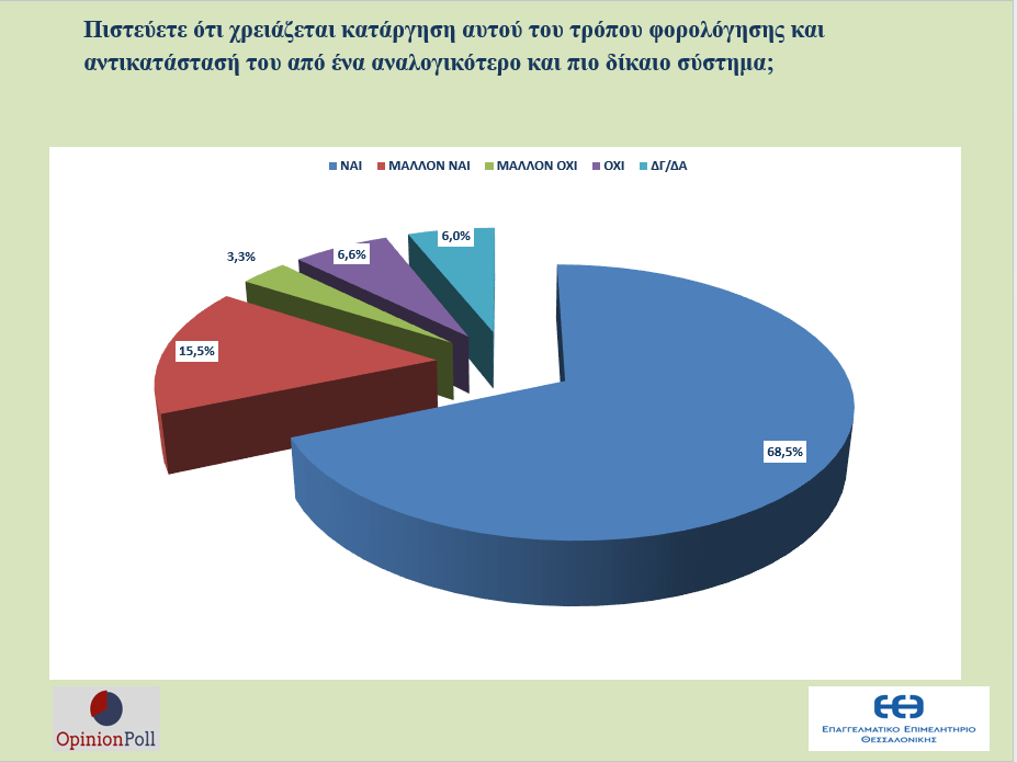 - Ωστόσο γενικότερα, η συντριπτική πλειοψηφία της τάξης του 84% ( άθροισμα ΝΑΙ και μάλλον ΝΑΙ) πιστεύει, ότι χρειάζεται κατάργηση του τεκμαρτού τρόπου φορολόγησης και αντικατάστασή του από ένα αναλογικότερο και πιο δίκαιο σύστημα.