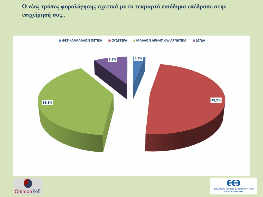 - Το 39.8% δηλώνει ότι η φορολόγηση με βάση το τεκμαρτό εισόδημα επέδρασε αρνητικά στις Επιχειρήσεις, ενώ το 48.2% ότι η επίδραση ήταν ουδέτερη.