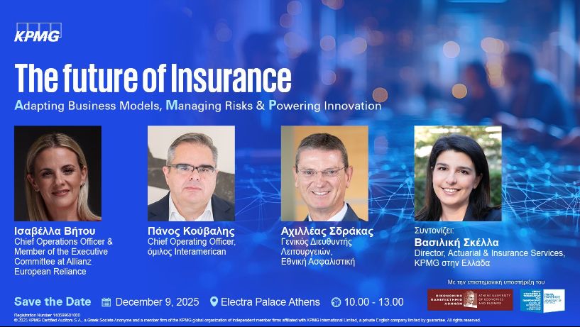 Η φετινή εκδήλωση της KPMG, “The Future of Insurance”, με tagline “Adapting Business Models, Managing Risks & Powering Innovation” και ημερομηνία διεξαγωγής την 9η Δεκεμβρίου 2025, φέρνει στο Electra Palace Athens διακεκριμένα στελέχη και ηγετικές προσωπικότητες της ασφαλιστικής αγοράς.